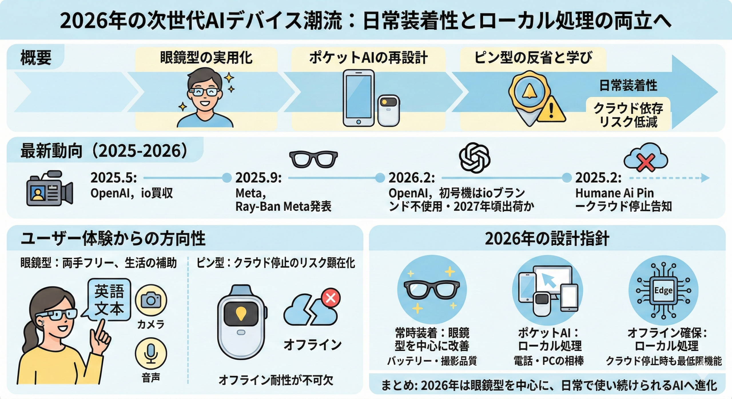 2025〜2026年にかけて、次世代AIデバイスの潮流は「眼鏡型の実用化」「ポケットAIの再設計」「ピン型の反省と学び」に収束しつつある。最新の発表・法的動向・サービス終了を踏まえると、2026年以降の勝ち筋は“日常装着性”と“クラウド依存のリスク低減”にある。
