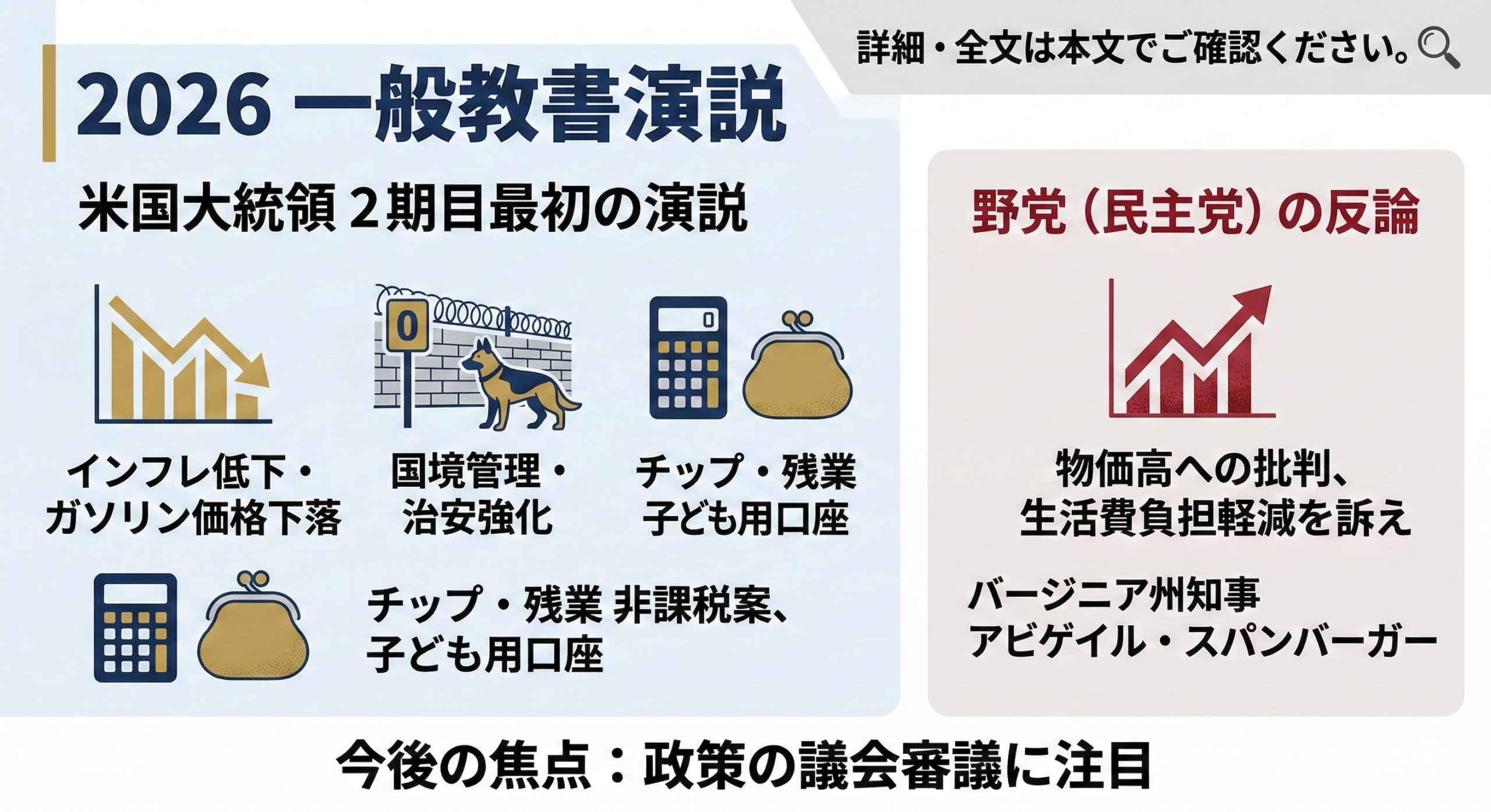 2026年2月24日、米国で一般教書演説が行われた。大統領は2期目最初の演説として、経済と国境管理を中心に成果と方針を述べた。