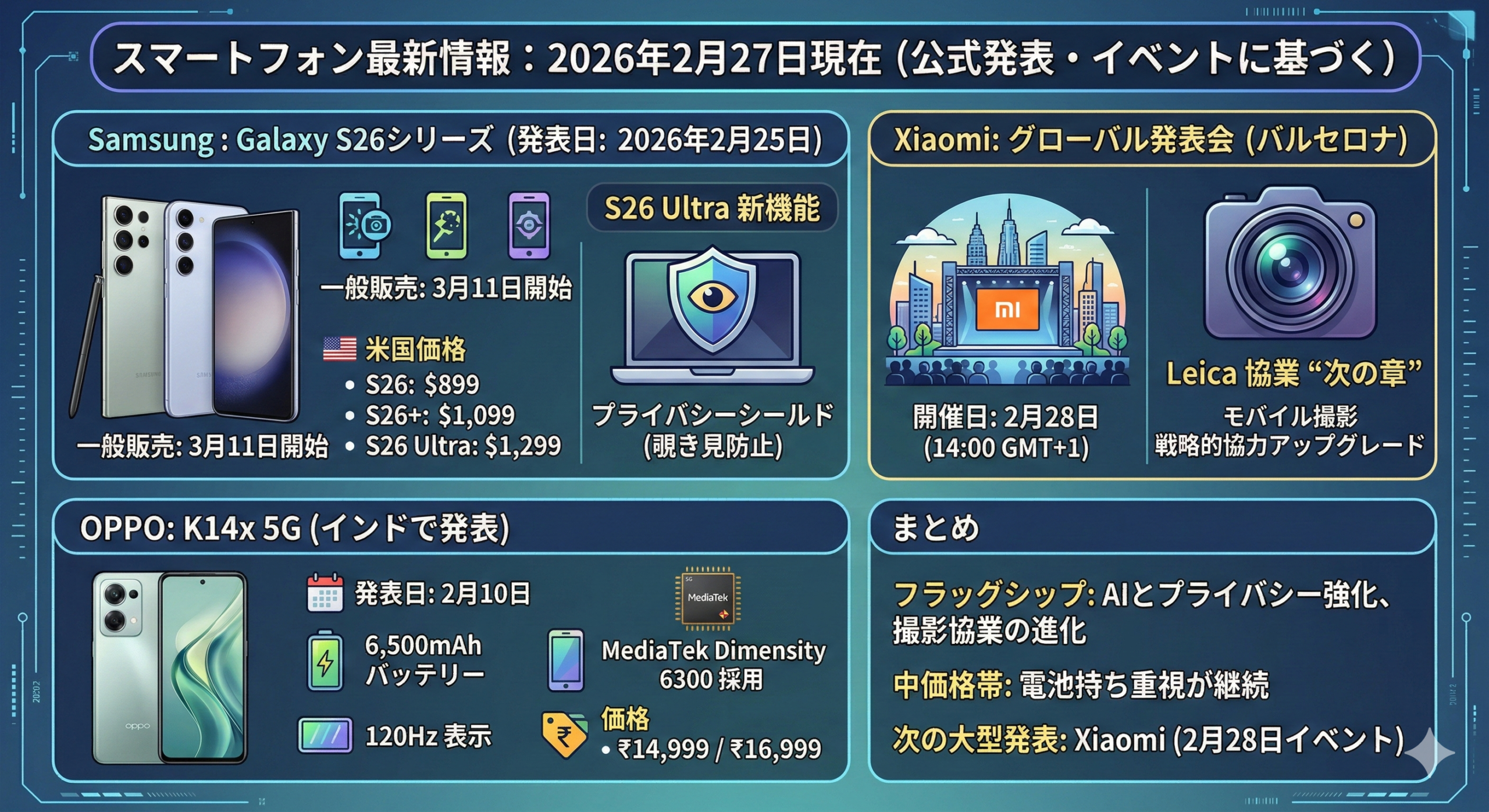 フラッグシップはAIとプライバシー強化、撮影協業の進化が中心テーマです。一方で中価格帯は電池持ち重視が継続しています。次の大型発表はXiaomiの2月28日イベントに注目です。