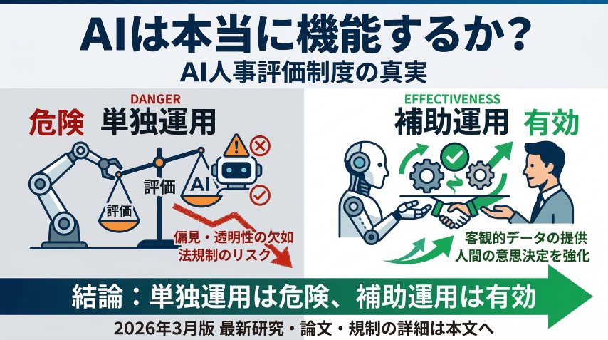 本当にAIが作った人事評価制度は機能するか? 2026年3月版 最新研究・論文・規制から見る「単独運用は危険、補助運用は有効」という結論