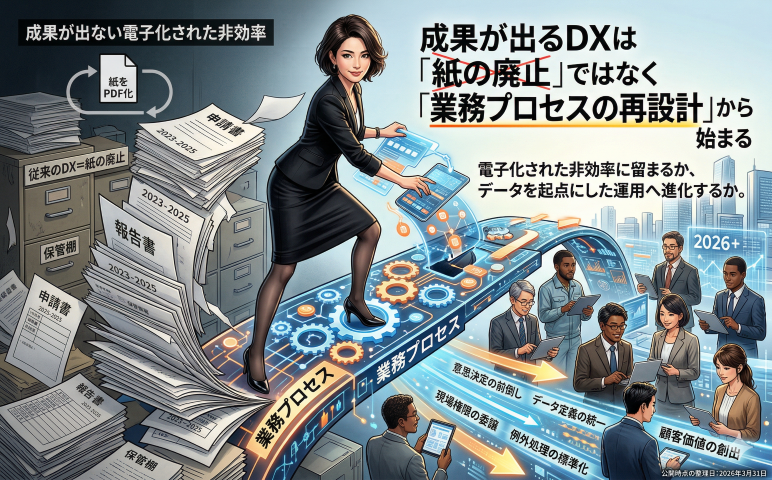 「DX=紙をなくすこと」という理解は、2026年時点では明確に古くなっています。最新の動向を見ると、成果を出している企業は、紙をPDFに置き換えるだけではなく、意思決定の流れ・例外処理・部門間の受け渡し・データ定義・現場権限まで含めて業務そのものを再設計しています。逆に、申請書を電子化しても承認段数や入力の二重化、担当者依存の判断、あとからの手修正が残れば、処理時間も利益も思ったほど改善しません。
