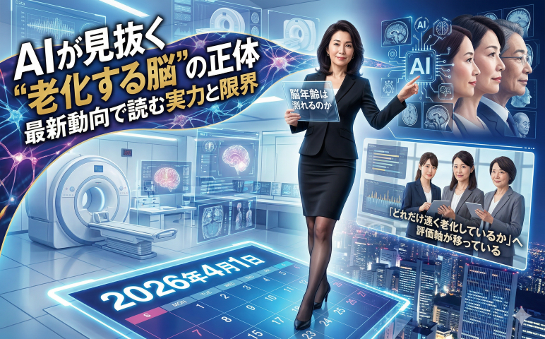 「脳年齢」は、MRIや睡眠脳波などのデータから、AIがその人の脳を何歳相当に見えるかを推定する考え方だ。2026年4月1日時点で確認できる直近の主要研究を俯瞰すると、結論は単純ではない。脳年齢は“ある程度は測れる”。ただし、それは健康診断の年齢欄のような単純な数字ではなく、疾患リスク、生活習慣、認知低下、脳萎縮、死亡リスクとどの程度つながるかを、統計的に読むための指標として使うのが現在の主流である。