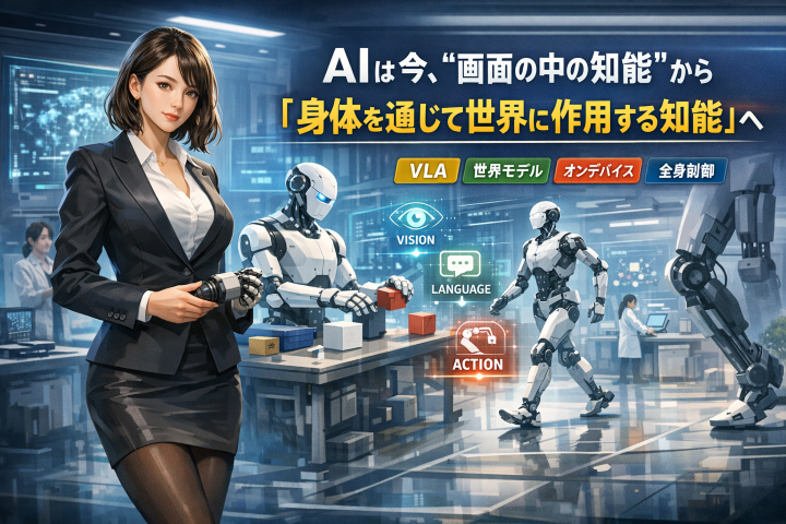 生成AIの中心がテキストや画像の理解・生成から、現実世界で見て、考え、動く段階へ移った。いま起きているのは、単なるロボット制御の高度化ではない。大規模モデルが、視覚・言語・行動・シミュレーションを横断して統合され、AIが「画面の中の知能」から「身体を通じて世界に作用する知能」へ変わり始めたことに本質がある。