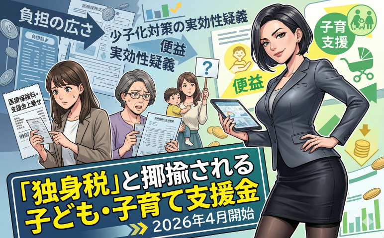 子ども・子育て支援金が「独身税」と揶揄されるのは、単に刺激的なレッテル貼りだからではない。2026年4月時点での批判は、負担と便益の非対称、政府広報への不信、少子化の複合要因に対する政策の射程不足、こども家庭庁への政治的不信が重なって生じている。